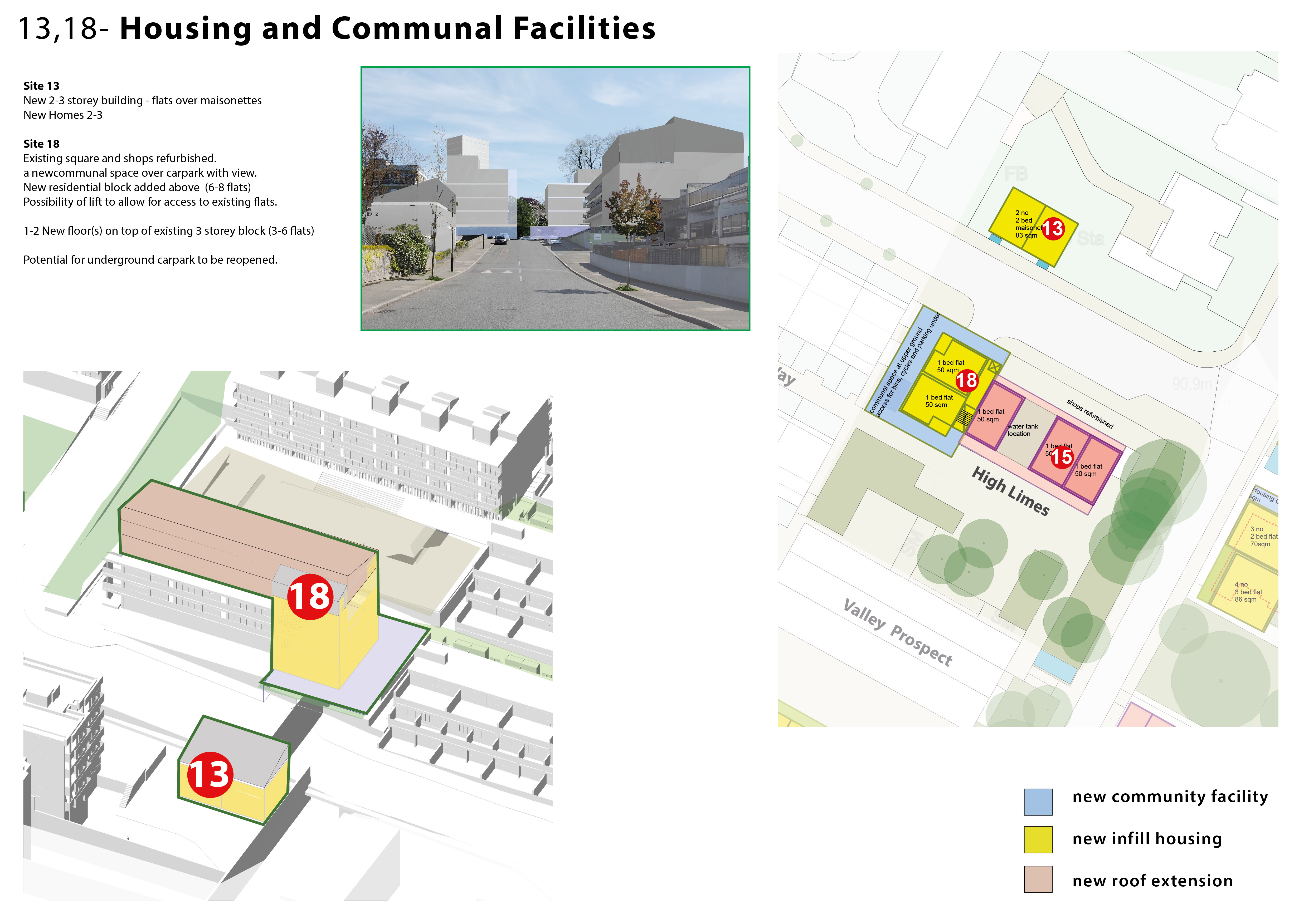 The existing community facilities currently occupy a large amount of area within the centre of the estate. ASH proposes that the existing communal facilities are demolished, and re-provided (day care centre, nursery, and community hall) along the edge of the estate along Lunham Road. This would allow an increase in the size of the green space, and improved play facilities.