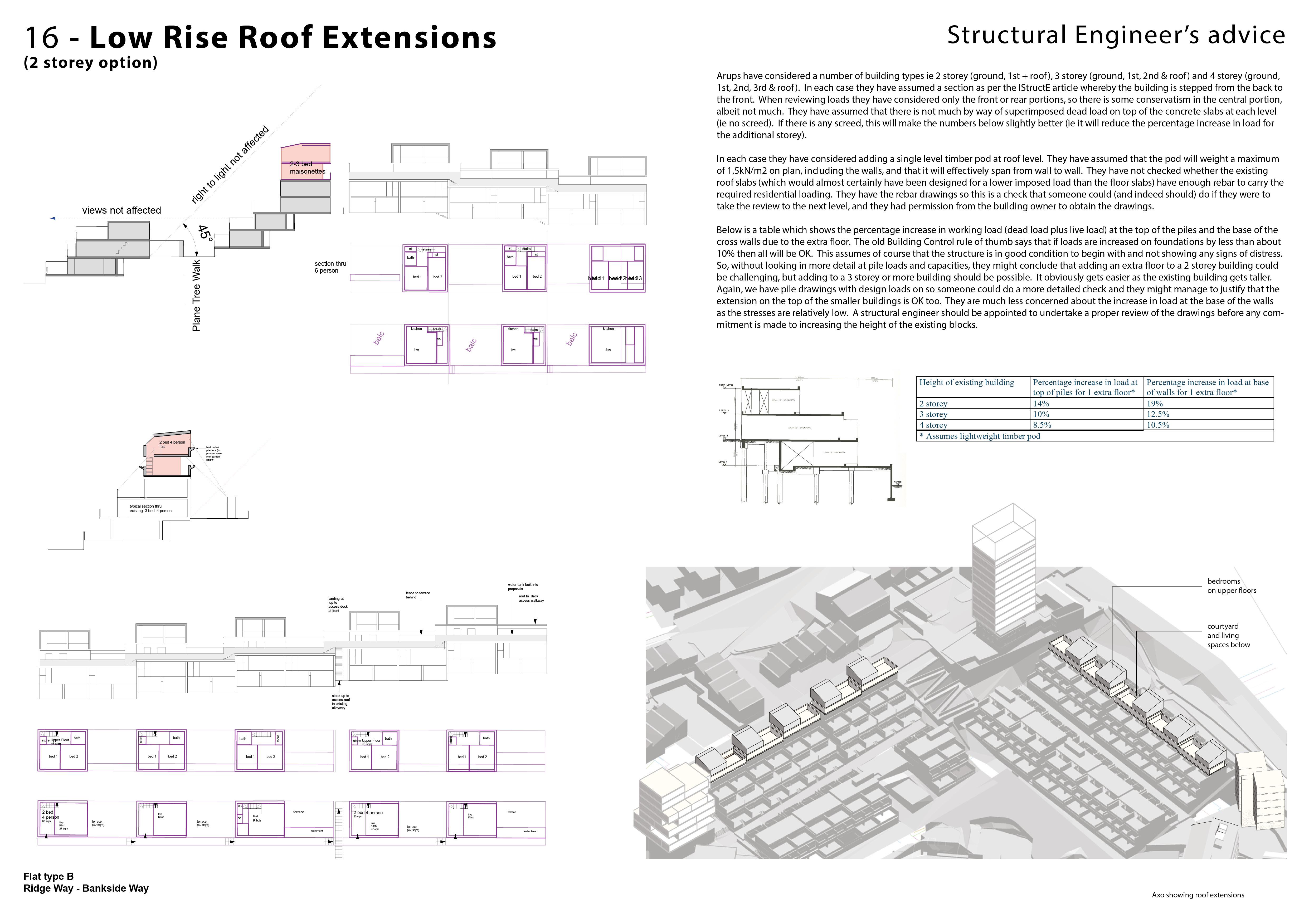 In each case they have considered adding a single level timber pod at roof level. They have assumed that the pod will weight a maximum of 1.5kN/m2 on plan, including the walls, and that it will effectively span from wall to wall. They have not checked whether the existing roof slabs (which would almost certainly have been designed for a lower imposed load than the floor slabs) have enough rebar to carry the required residential loading. They have the rebar drawings so this is a check that someone could (and indeed should) do if they were to take the review to the next level, and they had permission from the building owner to obtain the drawings.