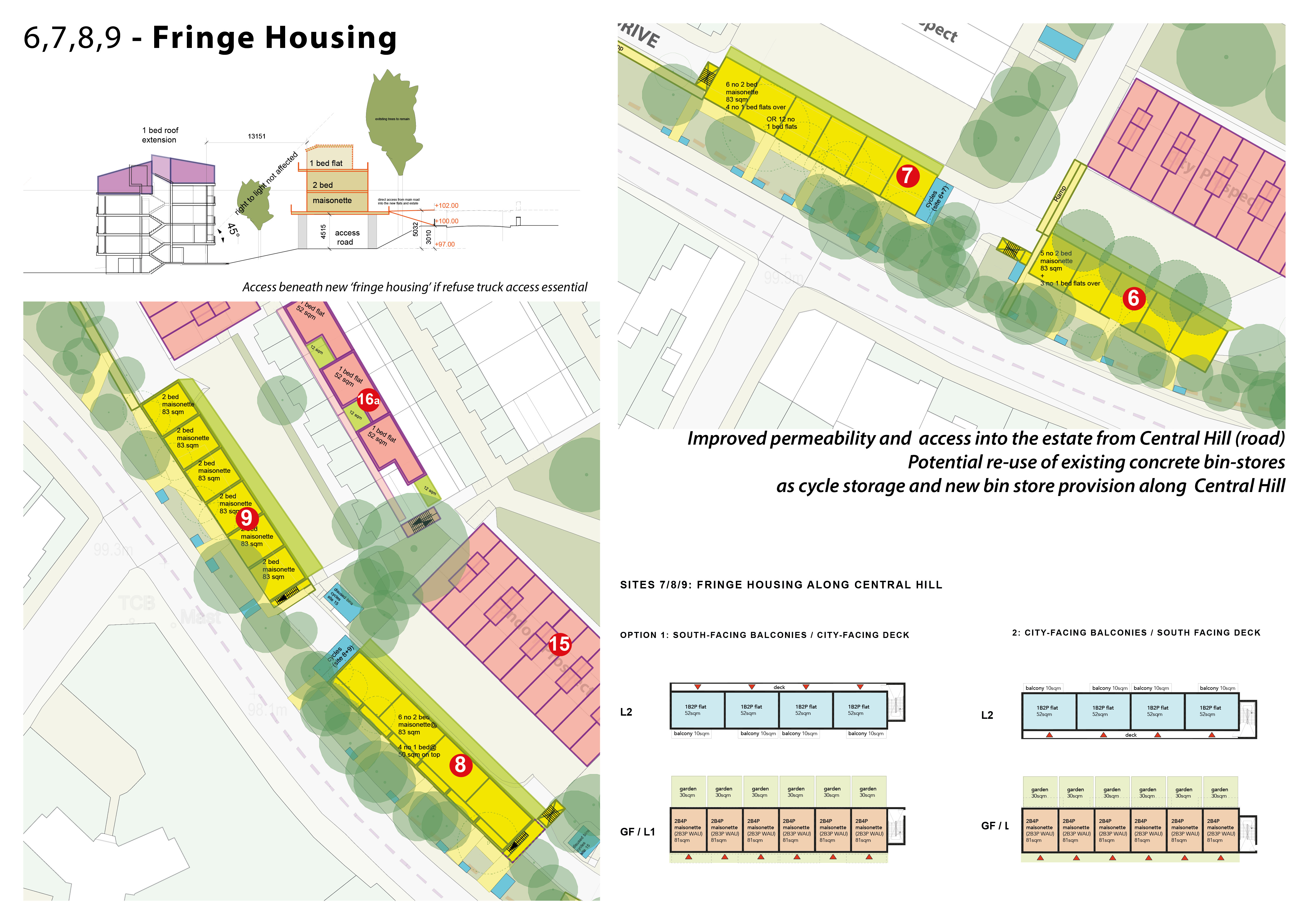 The new housing along Central Hill continues the theme of accessible housing and increasing permeability into the estate. We propose terraces of houses elevated above the access road (Oakwood Drive). If refuse and / or fire access is needed along here, this can be accommodated. However, with our suggestion to review the current refuse strategy, the soffit might be able to be reduced from 4.5 m. We are also under the impression that necessary fire access is achieved without the use of this access road, but this would need to be checked.