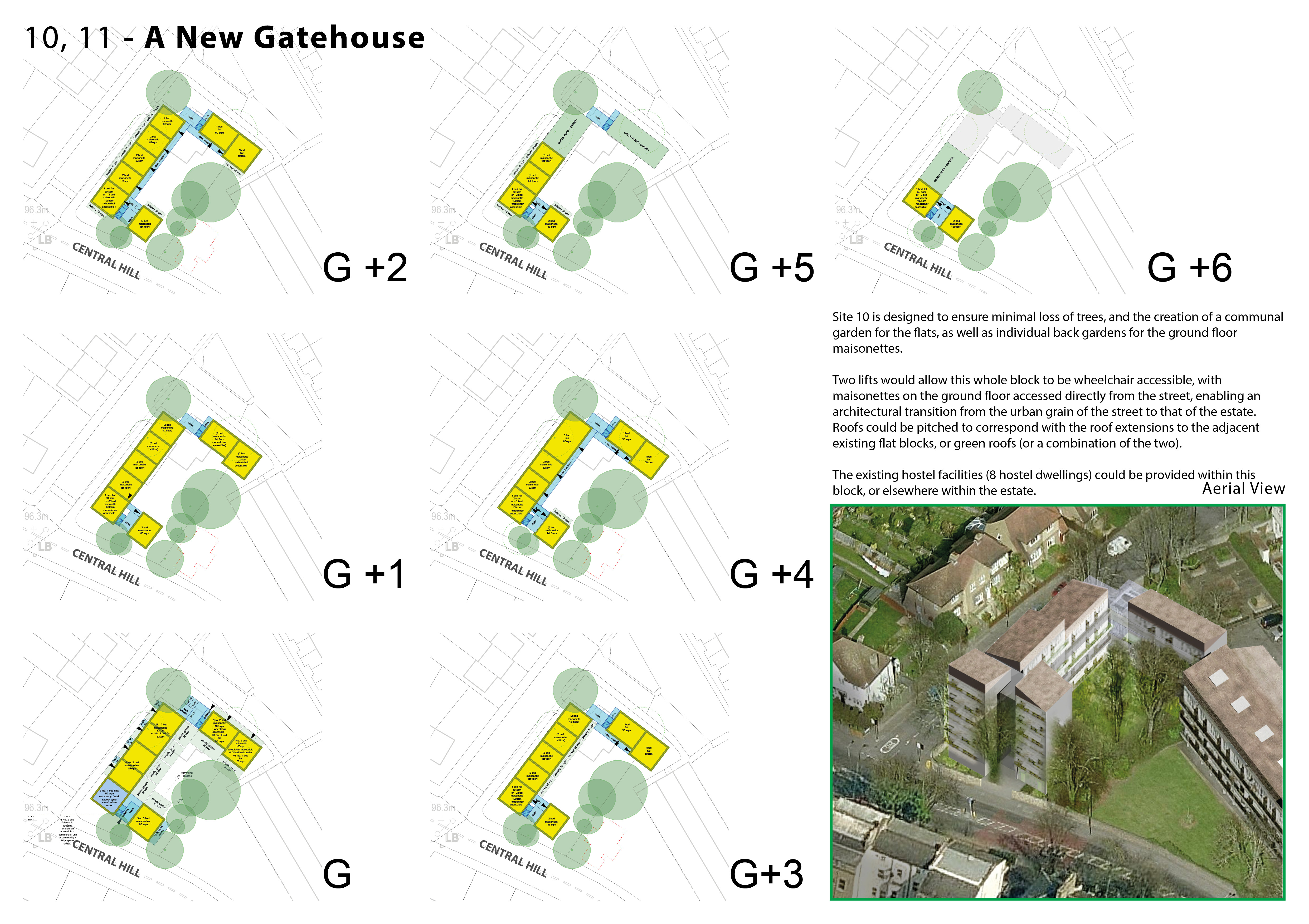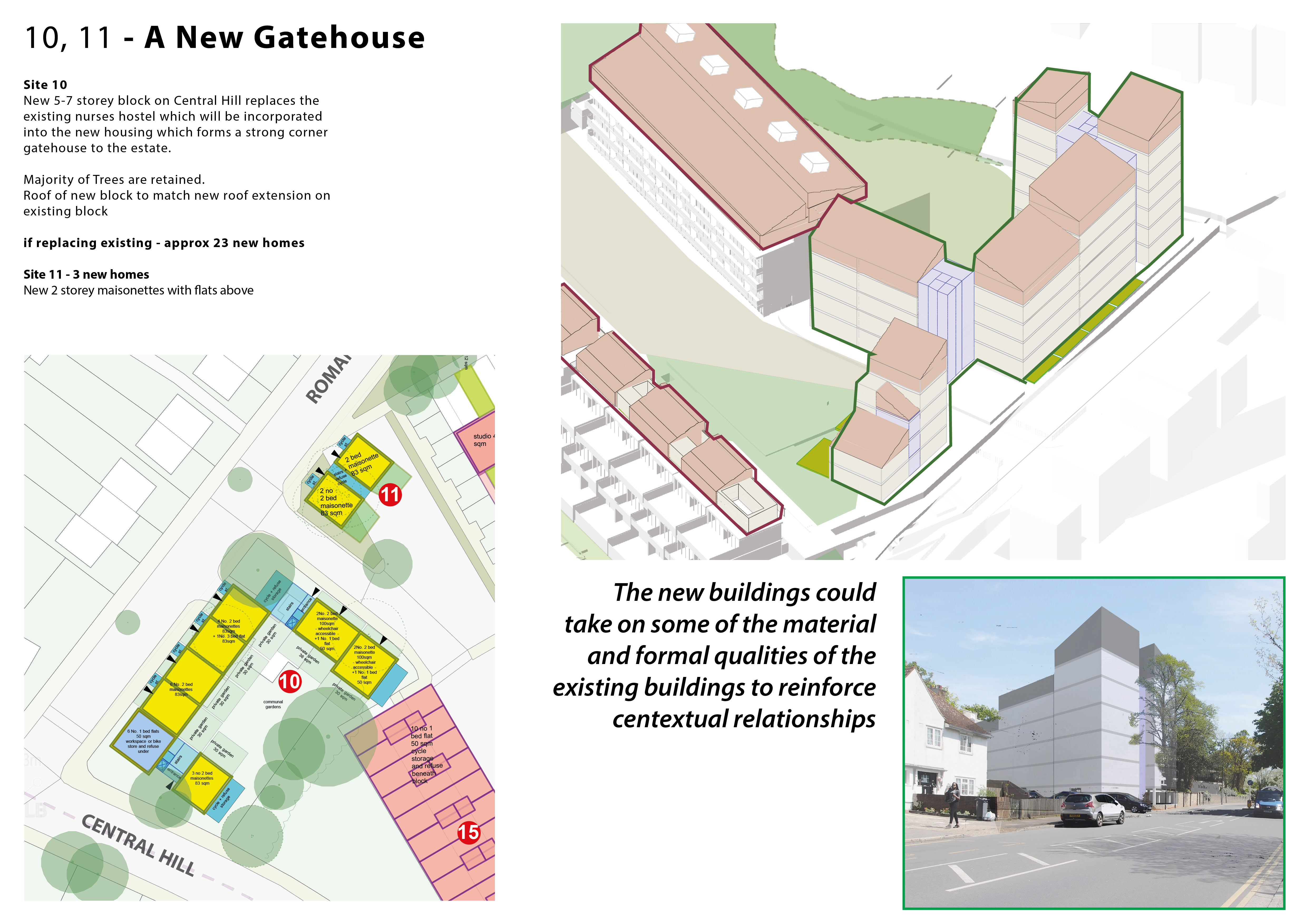 On the site of the existing hostel (which we believe to be only partially occupied in a temporary manner) we are proposing the construction of a new 5-7 storey block of flats (site 10), and a smaller block closer to the low-rise housing to the north (site 11). The site is adjacent to wide roads, so the buildings would not have any detrimental impact on any of the existing neighbouring houses. We would propose that the form and material of the new buildings emulate those of the existing buildings, to establish a sensitive relationship with their surroundings.