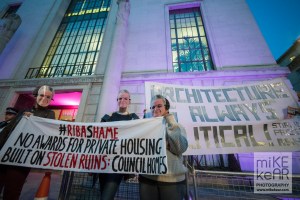 Unfortunately, despite last year’s protest by ASH and the debate it initiated, it appears the RIBA has still not understood the duties of the architectural profession and the stance it should be taking on the social cleansing of London through the Trojan Horse of estate demolition schemes. The recent RIBA publication on the Ethics of Estate Regeneration, while a welcome attempt to engage with these issues, failed to grasp the social consequences of this shameful episode in the history of British architecture. That the RIBA has chosen to nominate a development on the former Heygate Estate – perhaps the worst example to date of estate demolition in London, a bi-word for social cleansing, council corruption and private profiteering – shows just how distant their ivory tower is from the harsh reality of housing in the UK today.
