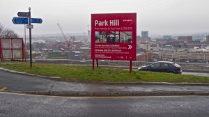As part of what property developers call ‘place-making’, a working-class tragedy has been re-branded as middle-class marketing strategy for Park Hill Estate. Against a backdrop of Sheffield’s industrial past, Urban Splash has transformed a line of estate graffiti (first editing out the name of the addressee, Clare Middleton) into a Tracey Eminesque neon sign which they use to promote the regeneration of Park Hill Estate for their middle-class clients. The words ‘Will you marry me?’, written on one of the bridges between the renovated north block and the old west block, becomes an invitation to join the shiny new vision of Sheffield the transformation of Park Hill represents – no longer as the heartland of steel production in the North of England, but as a call centre for foreign-owned companies.