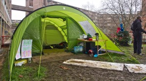 In response to these threats the camp moved from its original site to a lawn on the courtyard between the west and south blocks, providing better shelter from the icy winds on Park Hill. There are currently around 30 homeless people living on the site. On 13 January the defendant, now identified as Anthony Cunningham, was issued with a ‘Notice of Trespass Hearing’, for which he was fined with a £355 issue fee, and instructed to appear at Sheffield County Court on 25 January, 2017.
