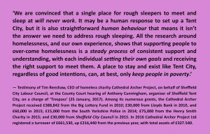 Nor were we surprised to discover that, in addition to its numerous other sources of income, the Cathedral Archer Project, which in 2016 registered a turnover of £661,530 (up £216,440 from the previous year) and declared assets of £327,540, receives a £30,000 grant from Sheffield City Council. As a Christian, Father Renshaw will forgive us for believing that his testimony in condemnation of Tent City was the quid pro quo for his 30 pieces of silver. Follow the money and you’ll find the corruption, and it inevitably leads all the way up to God’s pearly gates.