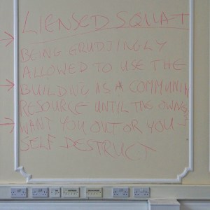 The Autonomous Nation of Anarchist Libertarians announced their intention to turn 102 Belgrave Place into a homeless shelter, and between 30 and 40 people were housed there during the occupation. The building’s numerous small rooms make it an ideal layout for a hostel, giving rough sleepers somewhere safe and warm to stay – something that can mean the difference between life and death during the winter months. The three large reception rooms were turned into a kitchen and dining room, community hall and workshop space. Another room was transformed into a film room, and Ken Loach’s I, Daniel Blake was one of the films listed for screening. The central location of the new hostel made it easy for people to donate food, clothes and bedding, and visitors were generous in donating all three. Given Westminster Tory Council’s stated practice of forcibly sending its homeless out of London, the squat was also a shelter from the Westminster Police.