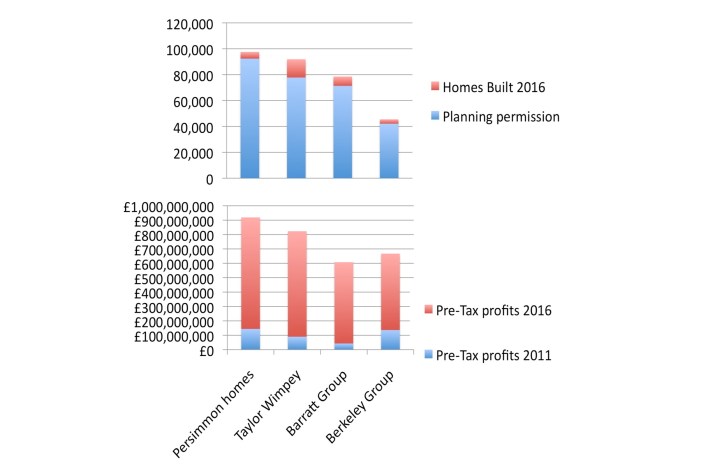 FACTS. Contrary to what we’re constantly told, the UK is anything but crowded. 10 per cent of England’s land is classified as urban; just 2.27 per cent of that land is built upon, and only 1.1 per cent is used for homes. Twice as much land, nearly 2 per cent of England, is taken up by golf courses as by housing. Persimmon Homes, currently sitting on land for 92,400 homes, built just 5,171 new properties in 2016, yet its pre-tax profits have risen from £144 million in 2011 to £774.8 million in 2016. Taylor Wimpey, sitting on land for 77,805 homes, built 14,112 properties last year, and its pre-tax profits have risen from just £89.9 million in 2011 to £732.9 million in 2016. The Barratt Group, sitting on land for 71,351 homes, built just 7,180 properties in 2016, yet its pre-tax profits have risen from £42.7 million in 2011 to £565 million in 2016. And the Berkeley Group, sitting on land for 42,125 homes, built a mere 3,350 properties in 2016, yet its pre-tax profits have risen from £136.2 million in 2011 to £530.9 million in 2016. In total, the pre-tax profits of the four largest builders in the UK – who are also the four largest land-bankers – were over £2.6 billion in 2016, a more than six-fold increase in just five years; yet between them they built less than 30,000 homes in the UK last year.