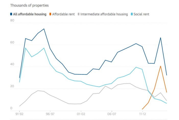 FACTS. Targeted by the London Mayor at 35 per cent of new developments, affordable housing now includes 25 per cent shared ownership on properties that in Inner London are selling for around £700,000 for a 2-bedroom home; rent at up to 80 per cent of market rate, not including service charges; and London Living rent at a third of the borough’s average household income with the obligation to purchase the property within 10 years. This Living Rent equates to £680 per month in the borough of Haringey, £770 in Hackney, £895 in Lambeth, £950 in Southwark, and £1,170 in Tower Hamlets. Even with these incentives, not a single London borough met its affordable housing quotas in 2015, with just 13 per cent of new homes approved as such – a 24-year low – largely due to builders and developers claiming anything higher was ‘financially unviable’. In the year ending March 2016, just 6,550 homes for social rent were built in the whole of England.