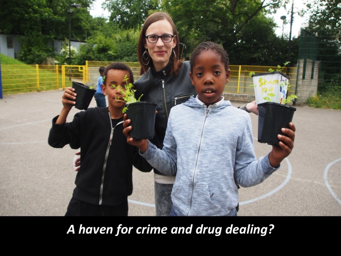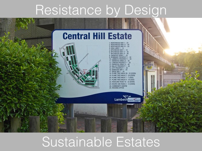 These last two slides were taken on Central Hill estate at a yearly event ASH organises called Open Garden Estates, which a dozen estates across London hosted last year. Open Garden Estates is designed to challenge the negative propaganda around council estates by inviting the public to visit, walk around and meet the resident communities. It’s also an opportunity for residents to organise and promote their campaigns of resistance to demolition, as well as make contact with other estate communities facing the same threat to their homes.