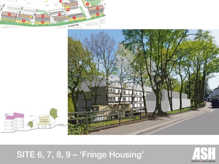 ASH’s proposal identifies the potential for between 200 and 240 new homes on Central Hill estate, roughly 40 per cent of the existing estate. In the aerial view above, infill housing (in yellow) is built on unused and derelict sites. Roof extensions (in pink) consist of one or two additional lightweight, pre-fabricated floors on top of some of the existing flats. These are situated around the edges of the estate, where their additional heights will not obscure residents’ views. Any issues that residents may have with the layout or the design of the estate can also be addressed through refurbishment and other design interventions.