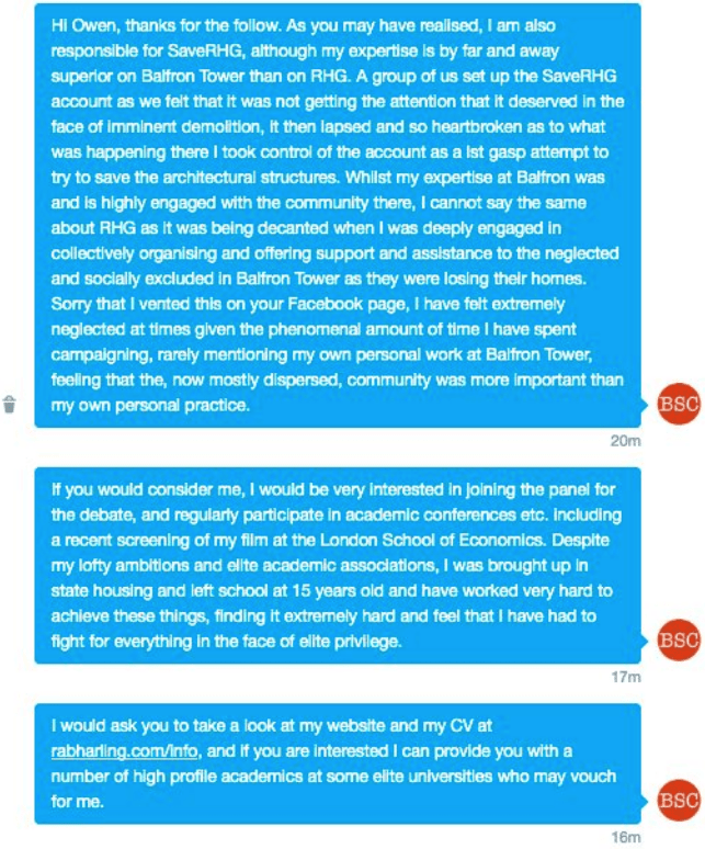 This childishly narcissistic reaction didn’t really surprise me. When we met Rab he was embroiled in a legal case, the details of which I never fully grasped, resulting from a long Twitter trolling campaign of employees from Bow Arts, the organisation that had given him a flat in Balfron Tower, including threatening them online, accusing them of all sorts of made-up lies, bullying and harassing other residents, and vandalising the flat when he was asked to leave. Of course, Rab tried to turn this into some sort of heroic resistance to the ‘establishment’ and himself into a housing campaigner. Indeed, he’s subsequently made something of a career out of portraying himself as a spokesperson for Balfron Tower. Following threats against employees of Bow Arts that included posting pictures of hammers online followed by pictures outside a member of staff’s home where his children live, Rab was arrested by the police, and in all the time I knew him he was living under the cloud of what the repercussions would be in court. At the trial Rab was instructed by the judge that if he didn’t plead guilty he was facing a custodial sentence, so Rab did as he was told and got off with a promise to be bound over. Within a month or so, however, he ignored the conviction and started his trolling campaign again, which continues to this day, as well as rewriting the facts about the incident, as he always does when the truth becomes inconvenient. I wasn’t particularly aware of all this at the time, but I began to realise that Rab had a problem when, the week after his trial, when I was congratulating him on not being sent down, he told me he had started another Twitter campaign against a Guardian journalist, Dawn Foster, whom Rab accused of stealing his research.