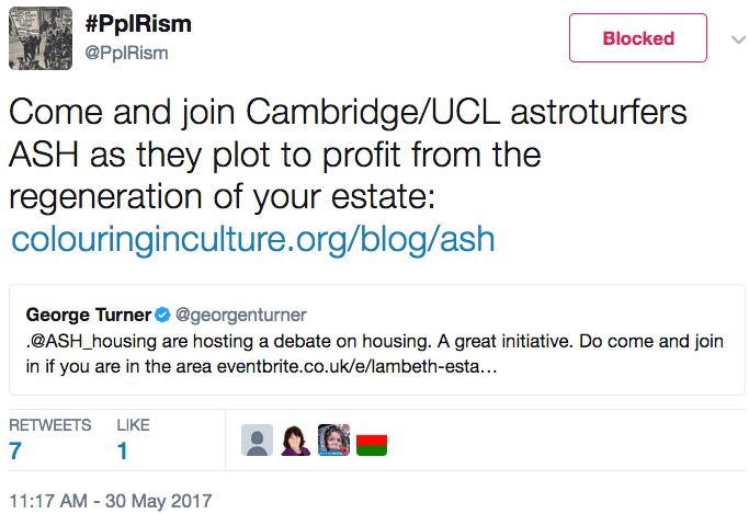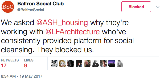 As I said, the trolling of us by these two over the past two-and-a-half months is no longer confined to ASH, but has extended to the organisers of the Small is Beautiful festival, whom they called on to ban us from their conference; the Focus E15 Mothers, whom they have warned not to share a platform with us; the Architectural Workers, whom they accused of being social cleansing profiteers; a resident of Cressingham Gardens who used the London Festival of Architecture to launch a book containing testimonies from her fellow residents facing demolition, and whom they also accused of art-washing; as well as the candidates for the Vauxhall constituency, whom they called on to boycott the Lambeth Estate Hustings organised by ASH. Even the horror of the Grenfell Tower fire didn’t stop Rab Harling from attacking the Green Party’s GLA member Siân Berry, one of the handful of London politicians to speak out against estate demolition, for the ‘crime’ of having attended Oxford University. There are no doubt even more groups and individuals these two trolls have targeted – either because of association with ASH or because Stephen Pritchard and Rab Harling, from the glorious purity of their keyboards, deem them to be ‘artwashers’ – but since we have blocked all communication with them we are, thankfully, spared both their bile and their ambition.