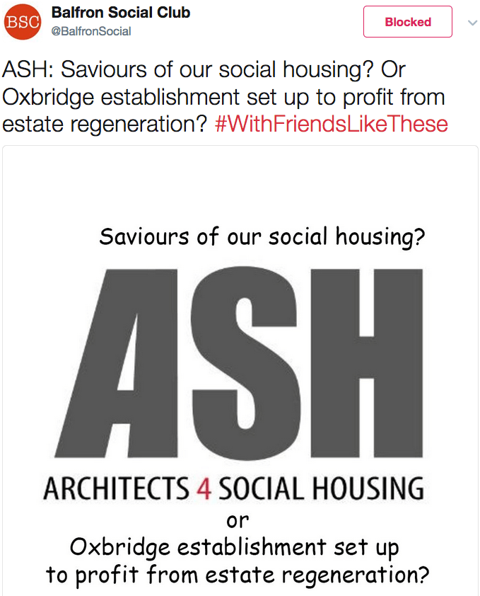 Towards the middle of May, Architects for Social Housing became aware that we were being subjected to what appeared to be a trolling campaign on Twitter. Knowing its origins – both the people behind it and their motivations – we blocked them and ignored it, hoping that they would tire of the publicity they got from attacking ASH and eventually go away. However, over two months later the trolling has not stopped, and has in fact expanded to include anyone who has anything to do with ASH, including the organisers of the Small is Beautiful festival, whose conference on ‘Housing Justice’ we spoke at in June, and the Architectural Workers, who last month organised a debate on ‘What is the Architect’s role in the housing crisis?’ at which we also spoke; as well as general call-outs to individuals and groups such as the Focus E15 Mothers and others not to share a platform with us. I must admit we sort of hoped that a knight in shining armour would come along and defend our blemished honour, but – alas! – it seems these days a girl must fight her own battles. Also, a number of people attacked by association have asked us why we haven’t responded. Unpleasant as it is, therefore, we feel we must explain where these attacks are coming from and why, and refute the accusations they make against ASH.