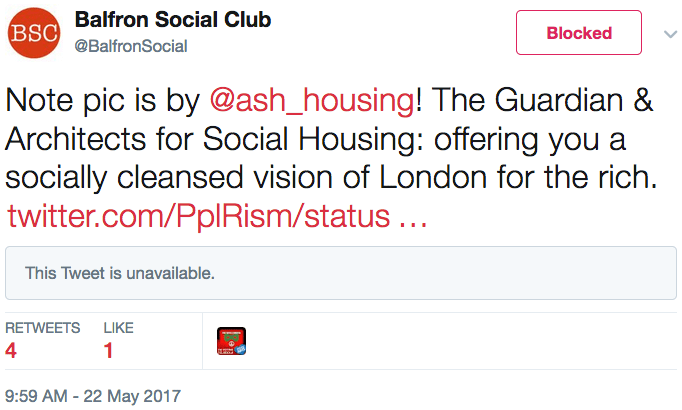 In response to our talk at the ICA, ASH has subsequently been offered the use of the Upper Galleries for one-week this August. We will be exhibiting the design alternatives to demolition from our work with various estates across London, as well as collectively creating a map of every estate regeneration currently taking place in the capital. We’ll also be hosting various talks by other groups about the housing crisis, as well as holding a meeting about the Grenfell Tower fire, on which we have recently published an extended report. As we anticipated, this has drawn further vitriol from our two Twitter trolls; but we can safely say we don’t anticipate seeing either of them turn up to give voice to their tweeted insults in any public forum more exposed than an anonymous social media account.