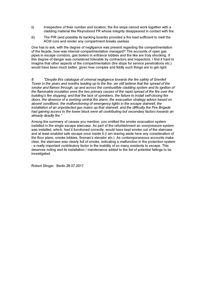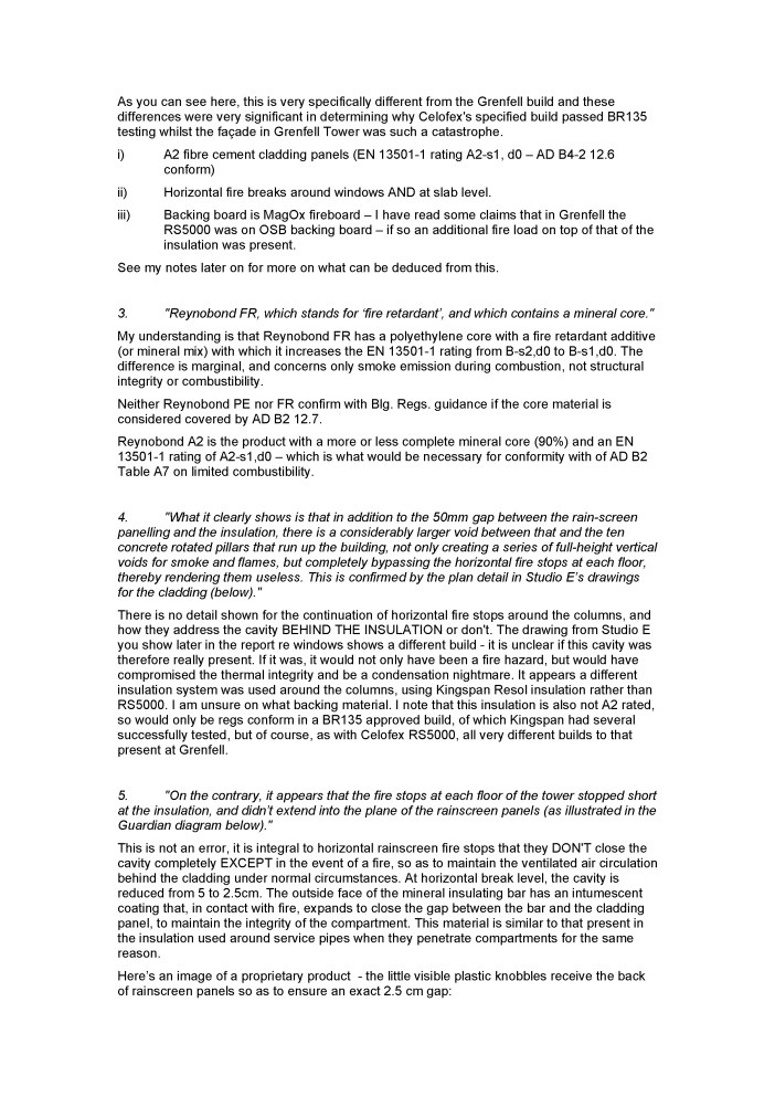 4. The main cause of the catastrophically rapid fire spread was the use of PE ACM, and the main cause of the use of PE ACM was the fact that the Approved Document guidance allowed its use. It would have been allowed from 1972 onwards when the definition of what was then Class O (‘oh’ not ‘nought’) was changed. This may be a tough enough standard for homogenous materials but is not for composite materials with a non-combustible facing like ACM. The dangers were pointed out in the 1999 ETRA Committee evidence – notably by Dr Bob Moore for the industry organisation Fire Safety Development Group – and the Committee recommendations if acted upon would have prevented the use of PE ACM. Again, after Scotland acted in 2005, England, Wales and NI failed to follow suit. I am not sure it is really a matter of deregulation per se, but of a failure to act to limit the use of convenient but lethal new materials. Those responsible should be prosecuted in my opinion. And the government and Opposition must stop lying and pretending that combustible ACM has been proscribed in the guidance since 2007. Andrew