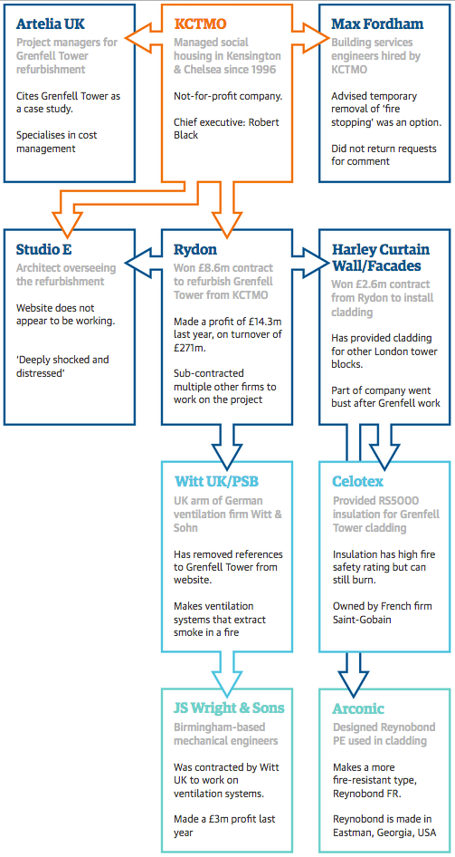 As this diagram from the Guardian illustrates (below), Artelia UK, which specialises in cost management, was contracted by KCTMO to be project managers on the Grenfell Tower refurbishment, which was carried out in 2016. On its website page on residential services, Artelia says that it ‘works closely with our clients to understand what success looks like to them and how we can make that success a reality’; and among its past experiences lists ‘refurbishment projects for local authorities.’ On its page on Health and Safety Management Artelia says it’s management results in a ‘safer, better, more cost-effective project.’ And on its page on Design and Construction Management Artelia says ‘we take full responsibility for architects, engineers, contractors and suppliers in a seamless process that drives out inefficiencies.’ Again, it cites its experience in working on programmes ‘where continuous reduction in construction costs is considered a non-negotiable contract deliverable.’ On the page describing its ‘involvement in the Grenfell Tower refurbishment project’ Artelia says that it was appointed as the ‘Employer’s Agent, Construction, Design and Management (CDM) Co-ordinator and Quantity Surveyor.’ Artelia describes the Grenfell Tower fire as a ‘tragic event.’