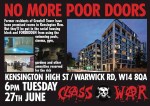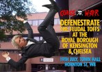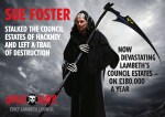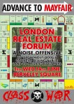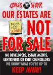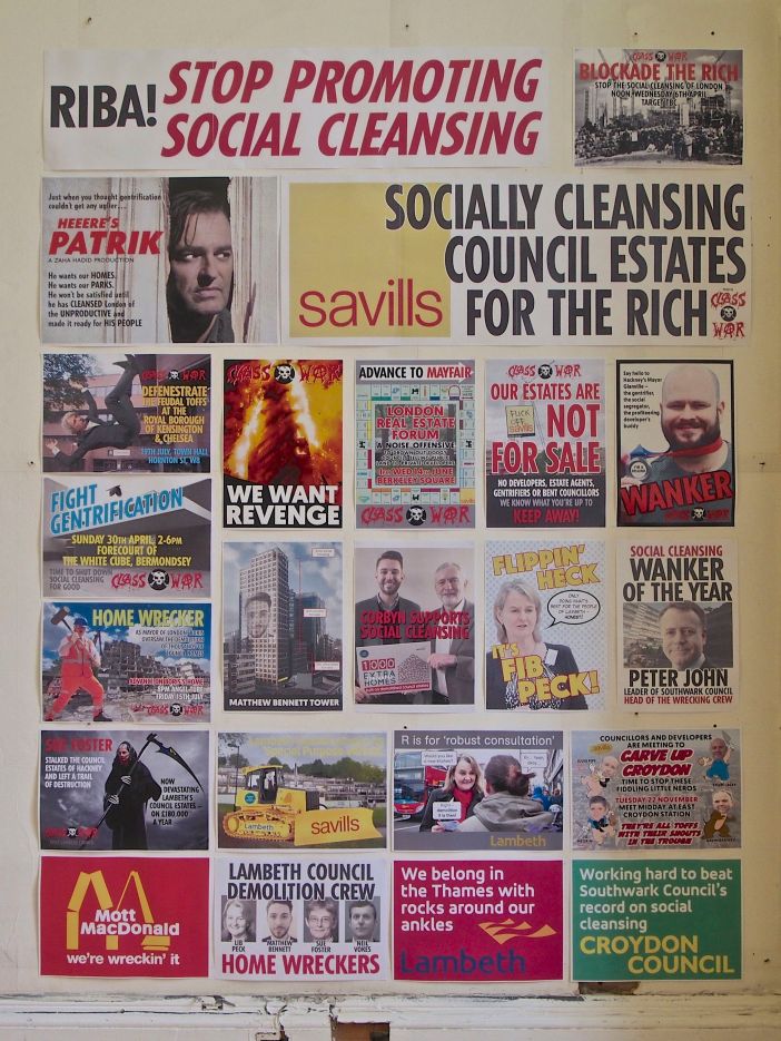 Posters and banners by anarchists who campaign and protest under the name of Class War to draw attention to and oppose the class dimension of estate demolition, while also identifying and holding to account the individuals responsible for the social cleansing it produces – whether architects, property developers, builders, estate agents, housing association CEOs, councillors, regeneration officers, council leaders, mayors, ministers or party political leaders.