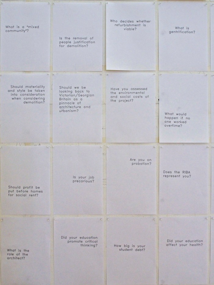 An independent and anonymous network of people who work in architecture and the built environment, Architectural Workers draws attention to and criticises both their own working conditions in architectural practices employed in estate ‘regeneration’ and the collusion of the profession in the social cleansing it produces.