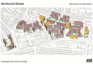 A council estate of 580 homes built in the 1930s and extended in the 1950s and recently stock transferred to the Guinness Partnership housing association, Northwold estate is now under threat of partial demolition and redevelopment. ASH’s alternative designs for infill and roof extensions for 245 flats match the total increase in the number of properties planned by Guinness, but unlike their proposals without demolishing a single existing home or evicting the current residents.