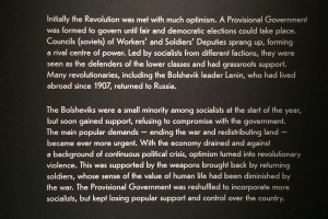 Within this narrative, however, the exhibition drew a strong distinction between the February revolution that brought in the Provisional Government and sought to oversee the transition of the Russian Empire to a capitalist state – a bourgeois revolution, in other words, that would place the middle classes in control of a democratically elected government – and the October revolution that overthrew that government and aimed to oversee the transition to a socialist republic. To this end, the exhibition’s wall texts described the former as being met with ‘optimism’ and enjoying ‘grassroots support’, while the latter was characterised as being brought about by the ‘revolutionary violence’ of a ‘small minority’ supported by returning soldiers ‘whose sense of the value of human life had been diminished by the war’.