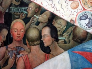 Located on Hanbury Street just off Brick Lane in the London borough of Tower Hamlets, the mural, titled Freedom for Humanity, was painted in 2012 by Los Angeles graffiti artist Kalen Ockerman, who works under the name of Mear One. Described by the artist as being ‘about class and privilege’, the image makes very clear references to the murals that were such a widely used format of social realist painting in the 1930s, and which drew so strongly on the work of the Mexican artist and communist Diego Rivera. Characteristic of the Federal Art Project funded by the New Deal under President Franklin D. Roosevelt, these were produced across the USA, with some of the most famous being Rivera’s Detroit Industry Murals (below) commissioned for the then thriving but now bankrupt city of Detroit. The language of social realism, which had its roots in late nineteenth-century realist painting, was revived in the 1930s to respond to three historical challenges: the stock market collapse of 1929 and the Great Depression that followed, which ground industry in capitalist countries to a halt and increased the possibility of working class revolution; the policies of the Popular Front announced by Joseph Stalin in 1934 that sought to promote solidarity between the Communist International and other left-wing groups in order to combat the rise of fascism (the British Labour Party, typically, refused); and the inter-war trajectory of modernism, which was widely seen as having abandoned social content for bourgeois formalism. To promote proletarian consciousness, align itself with the International and rectify the failures of modern art, social realism increasingly drew on the principles of Soviet socialist realism – also formulated in 1934 – according to which art must be proletarian, and therefore relevant to and intelligible to workers; typical, in depicting scenes recogniseable from the everyday life of people; realistic, in the representational sense, as opposed to abstract; and partisan, which is to say, supportive of the aims of the socialist state.