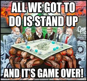 In any case, the depictions of the Monopoly players in the Brick Lane mural are not physiognomic stereotypes of a single or even of many races, but particular portraits of identifiable individuals; and of the four figures with enlarged noses, J. P. Morgan, who has the largest conk of all, was of Welsh lineage and a life-long member of the Episcopal Church. It’s also worth bearing in mind (by those with one to bear) that all six figures at the Monopoly table are long dead, being contemporary to the social realist idiom of the 1930s rather than portraits of the banking leaders of today – although many of their modern equivalents belong to the same families, which rather reaffirms the artist’s point about immense financial and political power being retained in the hands of a few individuals and passed down through families over generations. In other words, this is a history painting about the economic origins of the vast inequalities of the present moment. Indeed, since it was removed from the Brick Lane wall by the corrupt Lutfur Rahman, a meme made from the central part of the mural and captioned with variations on ‘All we have to do is stand up and their little game is over’ has been circulated on the internet (below).