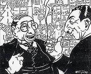 Equally familiar is the depiction of the bourgeoisie (below), in this case identified by the artist himself as Walter Rothschild sitting far left, J. D. Rockefeller second from the left, J. P. Morgan third from the left, Andrew Carnegie fifth from the left, Paul Warburg far right, plus the English occultist Aleister Crowley thrown in for good measure. Only two of these bankers were Jews: Rothschild having been instrumental in formulating the Balfour Declaration of British support for the establishment of an independent Jewish state in Palestine, and Warburg a German-born US banker and financial adviser to F. D. Roosevelt; while Crowley, in contrast, was an avowed anti-Semite. Far from representing a Jewish conspiracy, therefore, along the line of the Protocols of the Elders of Zion, the figures at the Monopoly board are representative of the power of Western capitalism at the beginning of the Twentieth Century. As further indication of this, in addition to the offical Monopoly player counters of the top hat, motor car and wheelbarrow – all signifiers of class difference – the artist has introduced New York’s Statue of Liberty, London’s Gherkin, and Paris’s Eiffel Tower, effectively symbolising three of the financial capitals of the contemporary world. There is no equivalent reference to Jerusalem such as the Wailing Wall or the Dome of the Rock.