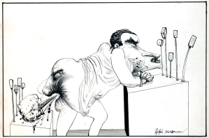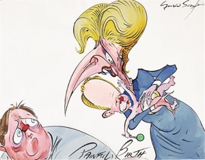 Now, I must pick my way carefully here, as a prominent proboscis is nothing to thumb your nose at. However, although an enlarged, hooked or bent schnoz is a characteristic of anti-Semitic stereotypes of Jews in – most famously but not exclusively – their depiction in Nazi propaganda in the 1930s, a big snout is not restricted to that signification. From the cartoons (below) of Napoleon Bonaparte by James Gillray and the Duke of Wellington by Thomas Rowlandson in the early Nineteenth Century to those of Richard Nixon by Ralph Steadman and Margaret Thatcher by Gerald Scarfe in the mid-Twentieth Century, the pointy or crooked hooter has been a signifier of aristocratic entitlement, personal ambition, moral corruption, political duplicity, capitalist greed, and a great many other flaws of character, and not only the attributed failings of a race. It is used as regularly in the depictions of Theresa May by Steve Bell as it was of Neil Kinnock by Spitting Image (below), and to my knowledge neither politican is Jewish, and neither caricaturist has – yet – been accused of anti-Semitism by the Twitterati.