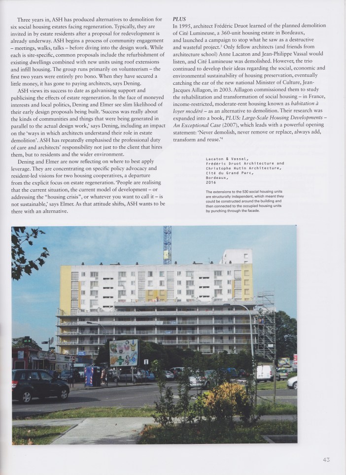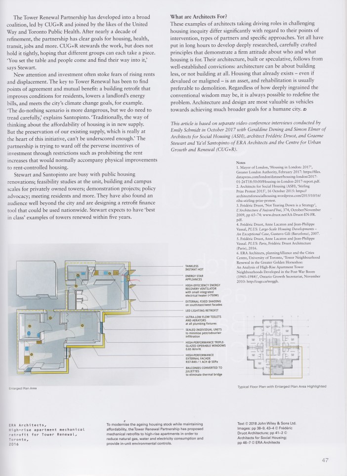 This article is based on separate video conference interviews conducted by Emily Schmidt in October 2017 with Geraldine Dening and Simon Elmer of Architects for Social Housing (ASH), architect Frédéric Druot, and Graeme Stewart and Ya’el Santopinto of ERA Architects and the Centre for Urban Growth and Renewal (CUG+R).