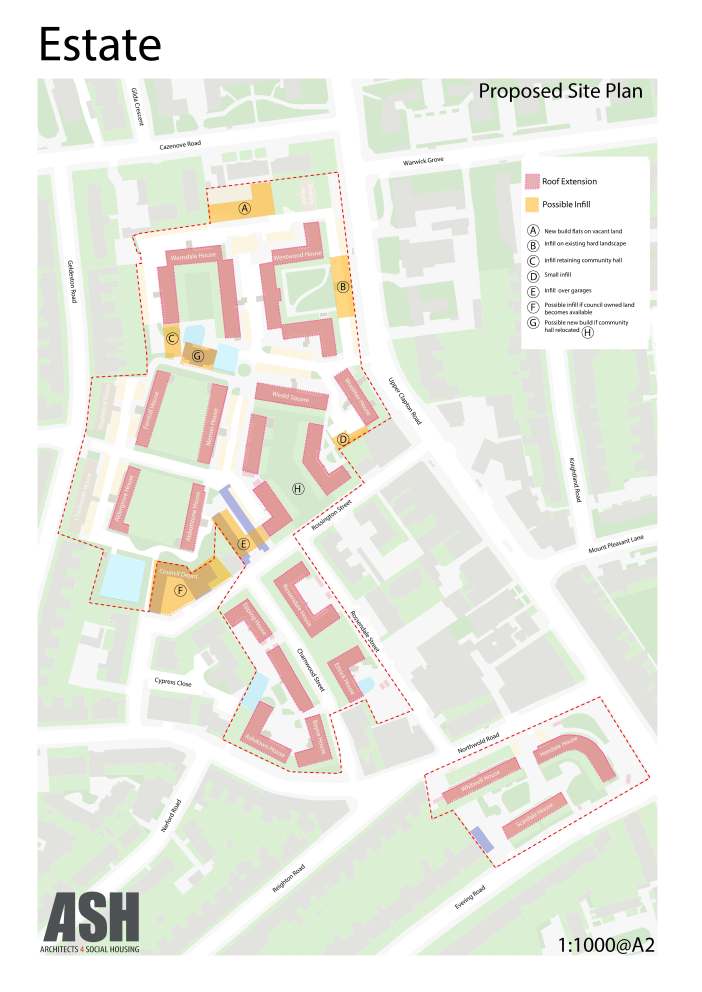 Our design alternatives for infill development on disused land and roof extensions on top of existing blocks found space for 245 additional flats, with the refurbishment of 18 disused flats, for a total of 843 homes. This compared with the 846 properties proposed by TM Architects, who had been employed by the Guinness Partnership to push through the demolition of 154 existing homes and the construction of 420 new properties. However, unlike their redevelopment proposals, ASH’s design proposals achieved this 42 per cent increase in the housing capacity of the estate without demolishing a single existing home or evicting a single one of the current residents. This would allow the tenure of the new flats to be for social rent, rather than the market sale and affordable rent properties required to replace the 154 demolished homes.