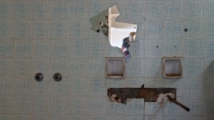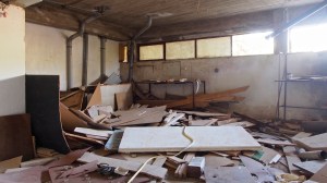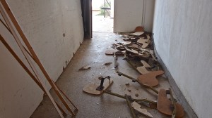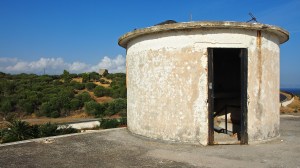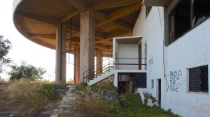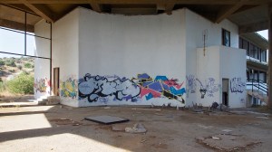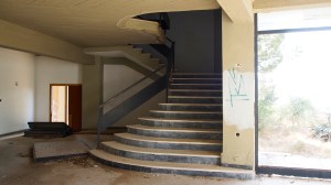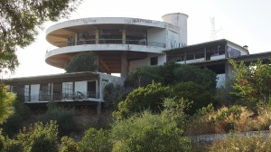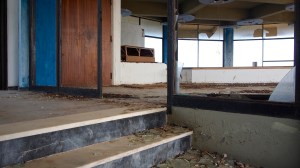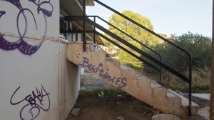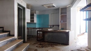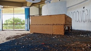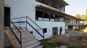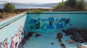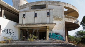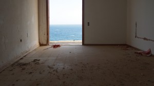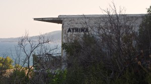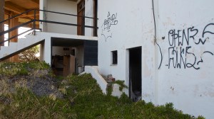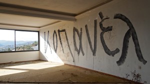 That on the road north out of Gythio, in the derelict resort of Lakonis, in front of the drained swimming pool, below the bird-shit encrusted stage of the dance hall, across from the cabin blocks named after the Greek gods, where a resort guide for 1998-99 lies on the concrete floor, and the marble steps of the central rotunda are all broken, where seagull feathers have piled up outside the empty well-shafts of the lifts, armrests from the vanished chairs of the conference room lie in the hallway, and the ovens of the orange-flower tiled kitchens sit open and rusted like crematoria, where every floor is covered with the shattered glass of every broken window, where the helicopter-pad looks down on a mile-long beach of turquoise-blue sea and white sand, and the hill-top wind still turns the turbine in the stairwell to the roof, a graffito reads ‘After laughter comes tears’.