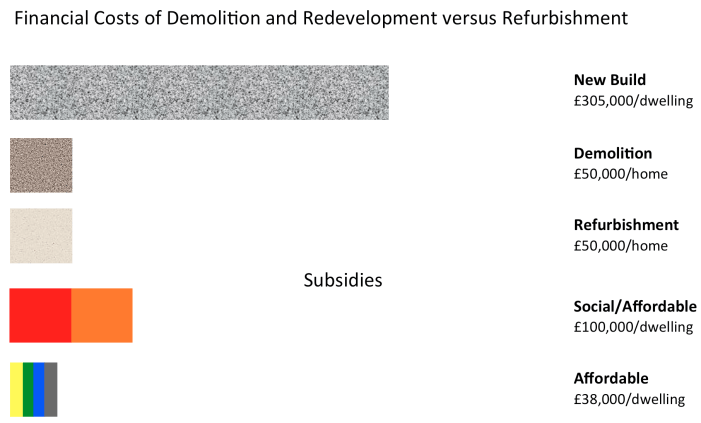 But in addition to the huge financial costs and debt risk associated with demolition and redevelopment, the environmental costs of both are huge, ranging from the loss of the embodied carbon in the existing buildings to the pollution in the air from demolition, to the environmental impact of the new buildings. To estimate what these are, ASH commissioned a report by engineers Model Environments, who calculated that: