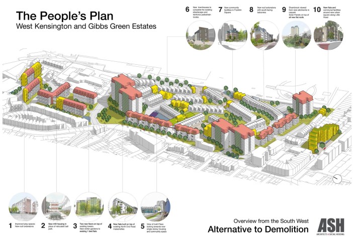 In contrast to this proposal, the feasibility study for which was designed by PRP Architects, ASH’s proposal retains and refurbishes all the existing homes, keeps as many of the existing trees as possible, while making all necessary improvements to the landscape and community facilities. Priced by quantity surveyors Robert Martell and Partners at £97 million, the ASH proposal would be paid off in around 25 years by the social rent and market sale – in roughly equal measures – of the new-build dwellings. The end result of the ASH scheme would be an increase in the number of home for social rent (indicated in red above), and nearly 50 per cent more (140 homes) than even Lambeth council’s proposed quota of London affordable rent (indicated in orange).