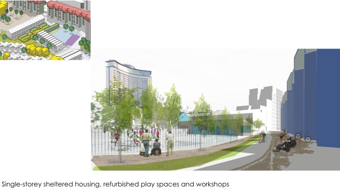 Finally, on the site of the current community centre, new high-density housing blocks (above) would provide a new entry to the estate around a public square and communal or commercial facilities on the main road.