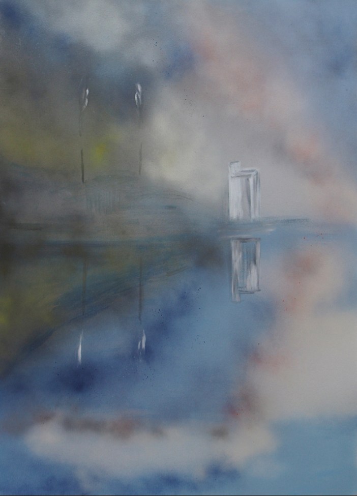 How to represent all this for a London audience? What technique will translate this modern tragedy into the language of paint and canvas? Pencil drawing, acrylic paint, spray can, print, photography, writing, sound recording. The absence of human presence from the places of their absence. The dissolving of the already abandoned, man-made structures into the ground of the canvas. The graffiti left on the walls of the buildings inscribed again on the surface of these canvases. The spray paint of the words become the spray paint on the canvas. Not the words, which are repeated in turpentine-thin paint, but the overlapping, intermingling patches of sea, water, reflection, sky, clouds, sun, mist, haze, shimmer, atmosphere.