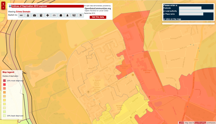 What does have a place in such an assessment is an objective record of the level of criminal activity on Ham Close estate, and the 2015 map of Indices of Multiple Deprivation for Ham Close reveals that, in common with the terraced council housing to the north and sough, the estate does have a higher level of income deprivation (the map on the left below) and unemployment than the Wates estate to the west with its more middle-class residents. However, the crime levels on Ham Close estate are no higher than the rest of Ham (the map on the right below). In fact, this map shows that there are higher crime rates around Ham Common to the south, but we don’t hear Richmond council calling for the demolition of the multi-million-pound Victorian townhouses and Georgian mansions that border its green spaces, claiming their architecture is the cause of anti-social behaviour and crime. In fact, this lack of evidence for an equation between crime and council estates accords with every estate ASH has ever located on this interactive map; and, indeed, housing estates typically have a lower level of criminal behaviour than the surrounding neighbourhood of terraced housing.