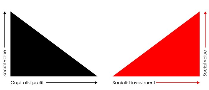 In this first diagram we have two opposing political economies, the capitalist and the socialist. Within a capitalist economy, the greater the social value of an architectural project — that is, the social housing and communal amenities — the lower the profit extracted from it; just as the greater the profit extracted from the budget, the lower the funds remaining for amenities of social value. While within a socialist economy, by contrast, the greater the financial investment in the project the greater its social value. It’s a simple diagram, but one that shows the contradictory mechanisms of these opposed economies. At present architects are working within a capitalist economy in which the more the state invests in a project through public subsidies at the point of both production and consumption, the higher the profits of the developer and investors. Help to Buy, to take just one example, has helped drive the huge increases in housing costs and the vast profits being made by developers; while state subsidies for so-called affordable housing has resulted in public funding being used to build properties for private ownership rather than housing need. The more public funding that is thrown at developers and buyers, the higher the cost of the housing they build and purchase, the greater the profits of the building industry and the larger the share of UK wealth that is locked into the housing market. Only a socialist economy can escape this cycle, by investing public funding where it should go, in social value. In housing terms that means the homes in which UK citizens can afford to live, not the properties in which investors wish to invest their capital.