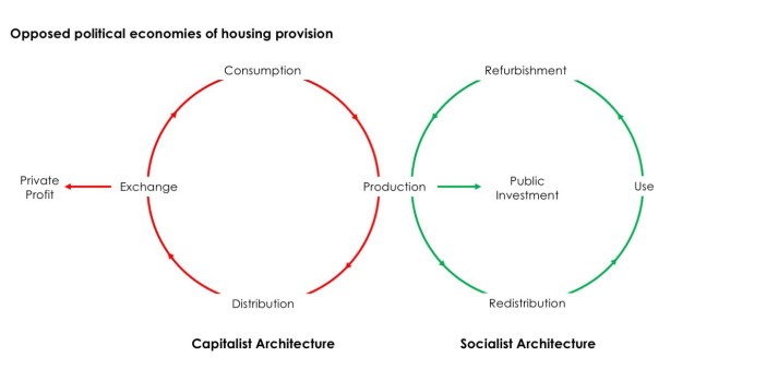 - A socialist architecture must produce publicly-owned housing in which public funds are invested, not market-sale housing through which those funds are extracted; thereby becoming a means for the redistribution of wealth, rather than its accumulation in fewer and fewer hands. Just as capitalist architecture is not merely an expression of the capitalist system but re-entrenches it, so a socialist architecture must become a means to redistribute wealth. At present, so much of our personal wealth is spent on paying our housing costs, every penny of which is making the rich richer, and the rest of us poorer.