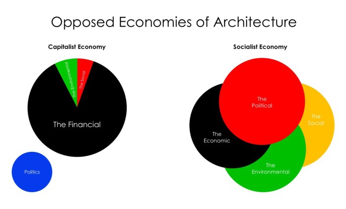 One of the things I’ve changed on this diagram from its use in our workshops on the social, environmental and economic dimensions of architecture is that the political sphere within a socialist economy is no longer blue — which is a conservative colour: it is, of course, red. But I’ve also changed the words. In a socialist economy, the political is distinct from politics, which is what this sphere is called, and how it functions, within a capitalist economy. There is a difference between politics, which is the grasp for executive power over the capitalist state, and political practice, which for a socialist who doesn’t believe in that old chimera of the parliamentary road to socialism (which is to say, a communist) is the attempt to overthrow the capitalist state and oversee a socialist economy.