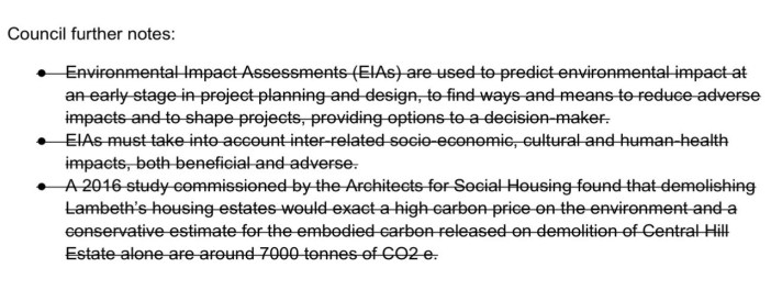 Now, under the influence of Extinction Rebellion, the Labour-run council had recently declared a ‘climate emergency’, much like every other council in London. So, one might think it would have no hesitation in adopting the propositions in this motion to reduce carbon emission in the borough, starting with looking at alternatives to the council’s estate demolition programme, and to make impact assessments of the social, economic and mental health effects of demolishing an estate a prior condition to a regeneration scheme. But no. Party politics always comes before political action, and Lambeth council, under its Labour Party administration, redacted the entire motion relating to estate demolition (above). This is only one example of many in which opposition parties will oppose, in principle, whatever is proposed by the party in power, regardless of whether or not it meets with, or is in contravention of, its own policies. In our experience, no political party has any principles, any policies, any ethical commitments that will get in the way of its goal of political power at any cost.