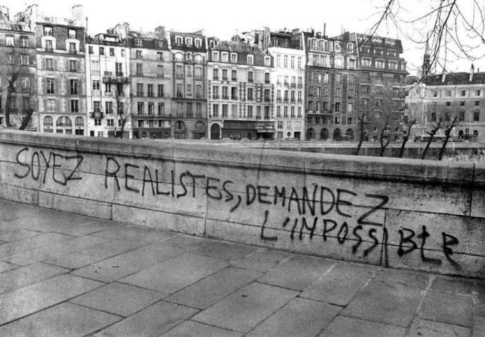 To accompany this poem I want to show this photograph (above) of graffiti on one of the bridges over the River Seine in Paris. If you don’t read French, it says: ‘Be realists: demand the impossible.’ This photograph was taken in May 1968 during the uprising in Paris, which saw a new collaboration between striking workers and radicalised — if not quite revolutionary — students. The story goes that at a meeting at the Renault-Billancourt car factory, whose workers went on strike for 33 days, a union boss said to the committee: ‘We must be realists: don’t demand the impossible.’ The next day someone who presumably was at that meeting wrote on the walls of the factory the slogan: ‘Be realists: demand the impossible.’