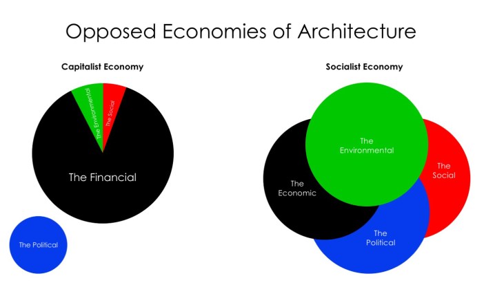 Comparing this to a socialist economy, I should point out that this is not a Venn Diagram, and that these are not overlapping spheres. I also want to point out that while, under our capitalist economy, the economic is reduced to a financial pie chart, in a socialist economy the financial sphere is expanded to the totality of economic exchanges. The social, the environmental, the economic and the political spheres are all metonyms, therefore, for the totality. They are not components of the totality, which would make this another kind of pie-chart; rather, they constitute different perspectives on that totality, and they function as different discourses. Language by its nature abstracts the totality into discrete objects of knowledge (capitalism then goes and sells that object as a portion of its financial budget); but in our social practice, in our economic growth, in our political policies, and in the environmental consequences these will have for us, they are indivisible. A socialist architecture must therefore understand each perspective, each dimension of its practice, within the totality of its relations.