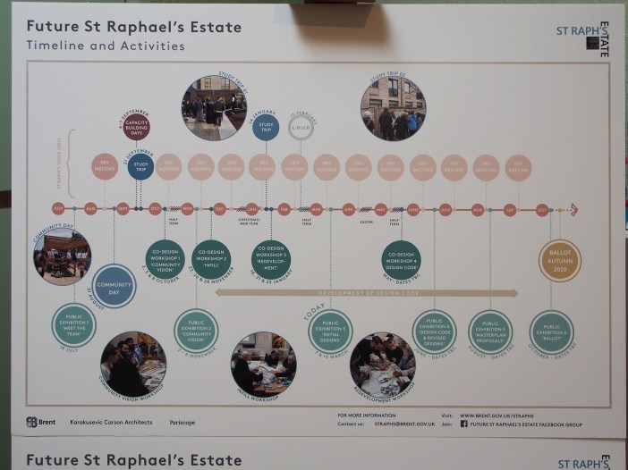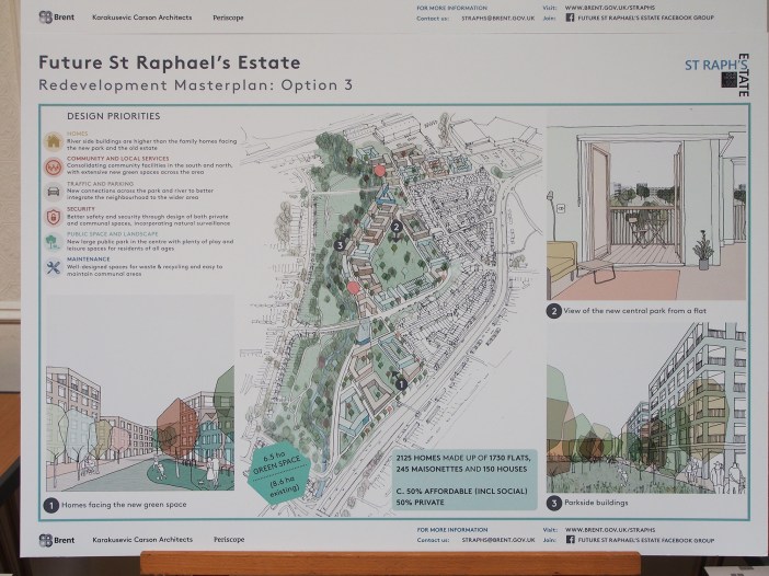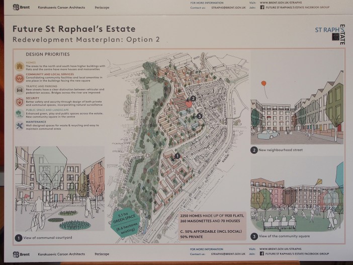 On Saturday, 7 March, Karakusevic Carson Architects (KCA) held a public exhibition of their ‘initial designs’ for the future of St. Raphael’s estate. The third public exhibition held to promote the redevelopment of St. Raphael’s, it was held in St. Patrick’s church, which is to the immediate north of the estate. In addition to the team of architects led by Sam McDermott, an Associate at KCA and project leader on the scheme, also present was Kathryn Eames, the Interim Senior Project Manager on the St. Raphael’s estate scheme appointed by Brent council, and also the Director of Accordus Ltd, a private company she established in January 2019 to co-ordinate and deliver regeneration and development projects for both public and private sector clients; plus several members of Public Participation Consultation and Research (PPCR), one of four consultancies employed by Brent council to convince residents to vote for redevelopment; as well as members of the board of St. Raphael’s Voice, the steering group composed of residents appointed by the council to lead the 760 households on St. Raphael’s estate through to the demolition of their homes.