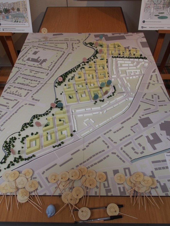 Models of Redevelopment Options 1-3. Like three pairs of different-coloured trainers that are otherwise identical but vary considerably in price, architectural design options are there to justify the selection of a compromise. In this case, our best bet is on Option 3 for the private development along the River Brent; Option 2 for the affordable housing bordering the North Circular Road to the south; and, for the shared ownership and rent-to-buy properties to the north, where the options vary little except in their extent, whichever one brings the scheme to financial viability once the developers have taken their 20 per cent profit margins, so most likely Option 2 again.