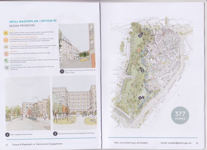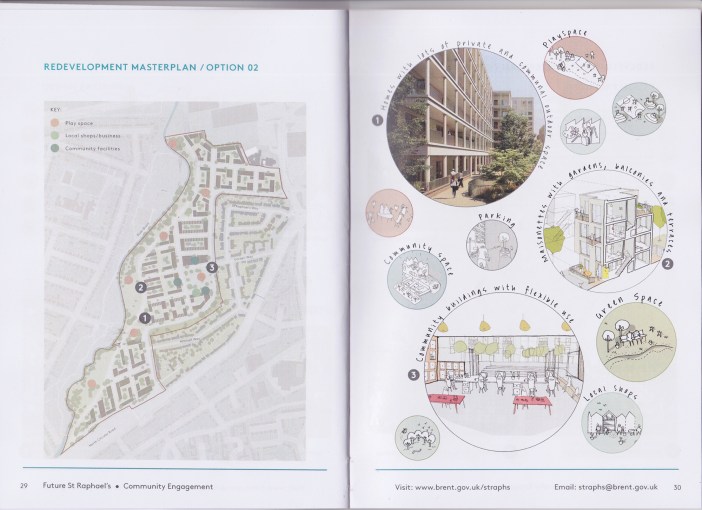 These options, it should be remembered, are merely masterplans, designed to convince residents to vote for the demolition of their homes. In other words, they’re as good as it’s going to get. The actual built development will be designed after the resident’s ballot vote in October, and possibly by a different architectural practice that will be selected by Brent council after the contract is put out to tender. The development that actually gets built — and about which residents of St. Raphael’s estate will have no say whatsoever — will most likely be different to these masterplans in ways that will always be for the worse. That is to say: at the expense of the affordability and tenure of the affordable housing component, in order to generate greater profit for the developer, resulting in the loss of even more green space, the further increase in the height of the buildings, the privatisation of even more community facilities, and possibly the gating of the private development.
