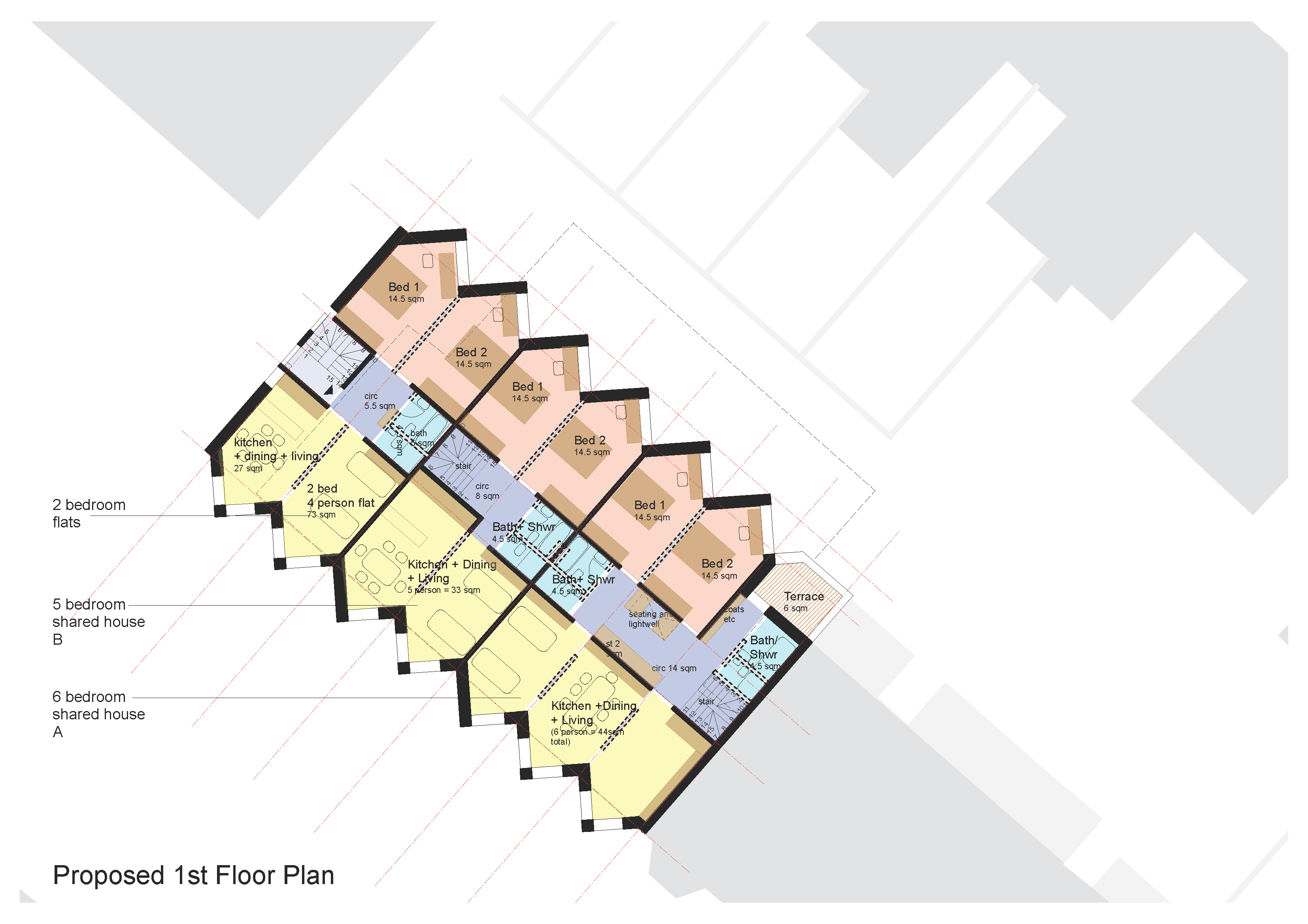 Above the ground floor, ASH proposed dividing the development into 3 ‘houses’, each of which could accommodate 4-5 good-sized double bedrooms with shared bathrooms, kitchens, dining spaces and living rooms, as well as outdoor roof terraces overlooking the shared gardens. In ASH’s designs, these ‘houses’ all have separate entrances from the street, as well as separate bin and cycle-storage facilities. The primary shared spaces in each of the houses — including the kitchens, dining and living rooms — would be situated on the first floor and facing onto the street below. The structural design, with non-load-bearing interior walls, allows the shared spaces to be either opened into a single open-plan space or sub-divided to accommodate smaller, more private spaces, depending on the needs of the residents.
