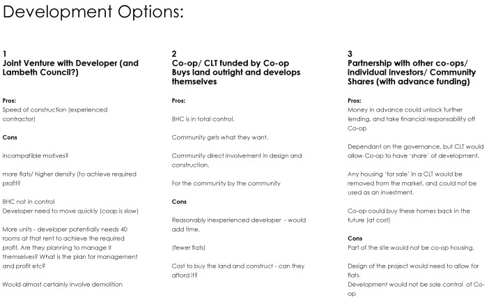 As well as helping the residents to make decisions, if the Brixton Housing Co-operative was offered the opportunity to go into partnership or joint venture with the existing developers — or indeed another entity — these principles would be part of any agreement with them, and so would create and ensure co-operative foundations for both the relationship and the form of the final project.