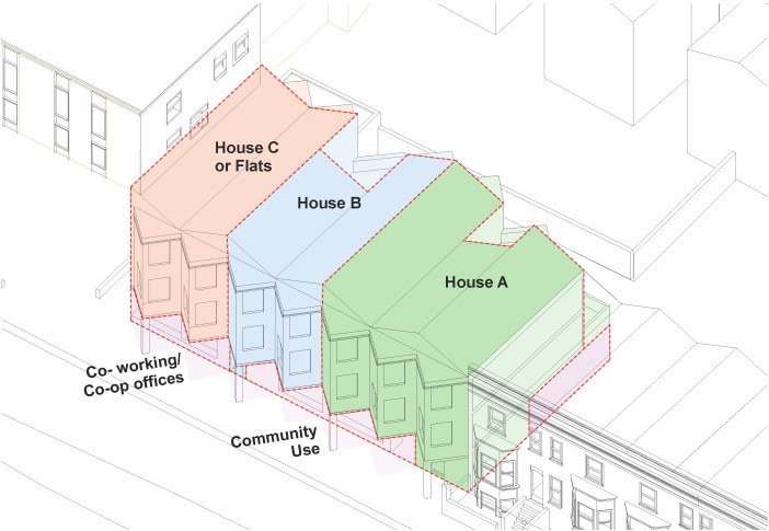 In summary (below), the Brixton Housing Co-operative could 1) become a development partner with a property developer, subject to a potentially complex partnership agreement; 2) develop the site itself, perhaps as part of a Community Land Trust; or 3) go into partnership with other co-operatives or investors. If necessary, one of the three proposed houses could be altered to accommodate a self-contained flat, which could then be sold as part of a Community Land Trust to raise funding. In addition, the community facilities on the ground floor could be rented out commercially to generate revenues.