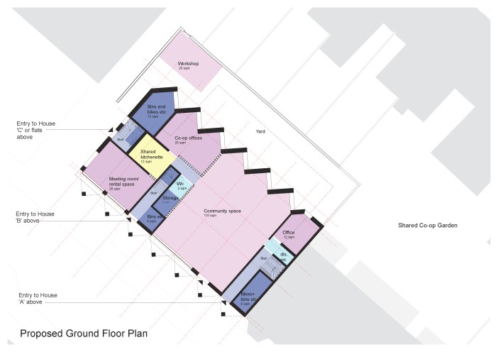 To meet these demands, we proposed that the ground floor of the new development would accommodate a range of community spaces, including a meeting room and kitchen, with the potential for shared workspaces, including a rear yard with a fitted workshop. The exact configuration and function of these spaces would be subject to local consultation and community need, but would be designed to be as flexible as possible to allow for changes of use in the future.
