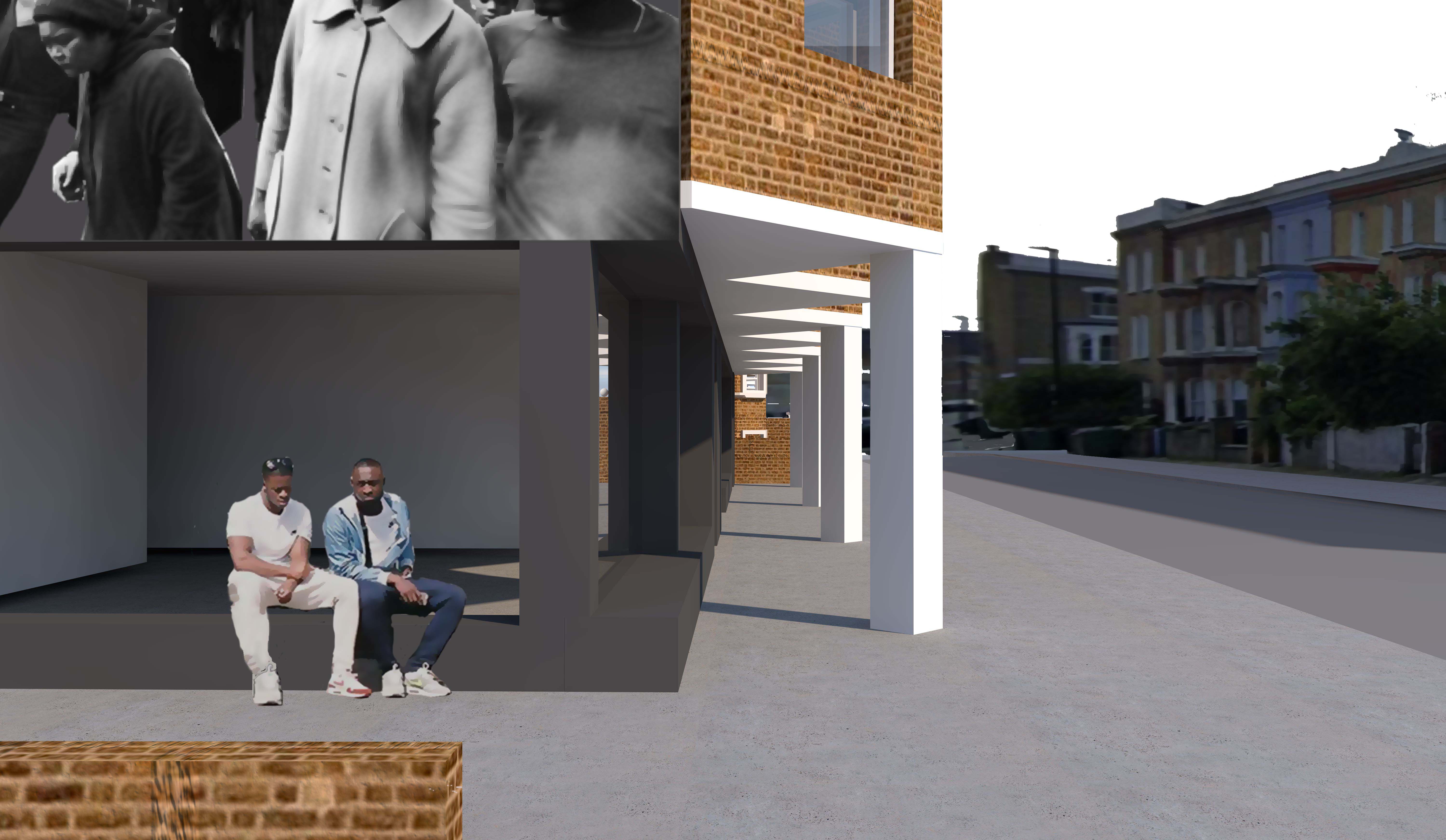 As a community space, it’s important that the outside of the building, where the large windows face onto the street, should have ledges or window-seats on which both passersby and residents can sit, breaking down the barrier between the inside of the building and its outside (above). It is a characteristic of Brixton culture, with its roots in the Caribbean, that it takes place on the street rather than indoors. However, under the orthodoxy of so-called ‘defensive architecture’ (anti-homeless spikes, walls and benches), which is removing places in which people can congregate in public, allied to aggressive policing and Public Space Protection Orders, this has become more and more difficult — if not impossible — in Inner London. We believe in resisting this assault on our rights of assembly and movement by designing the outside space of the building — yet still within the legislative boundaries of the site — as a place for congregation from which the public cannot be dispersed by police or council orders. This private space, made available for the use of the public, would be demarcated by columns supporting the bay windows above, forming a colonnade.