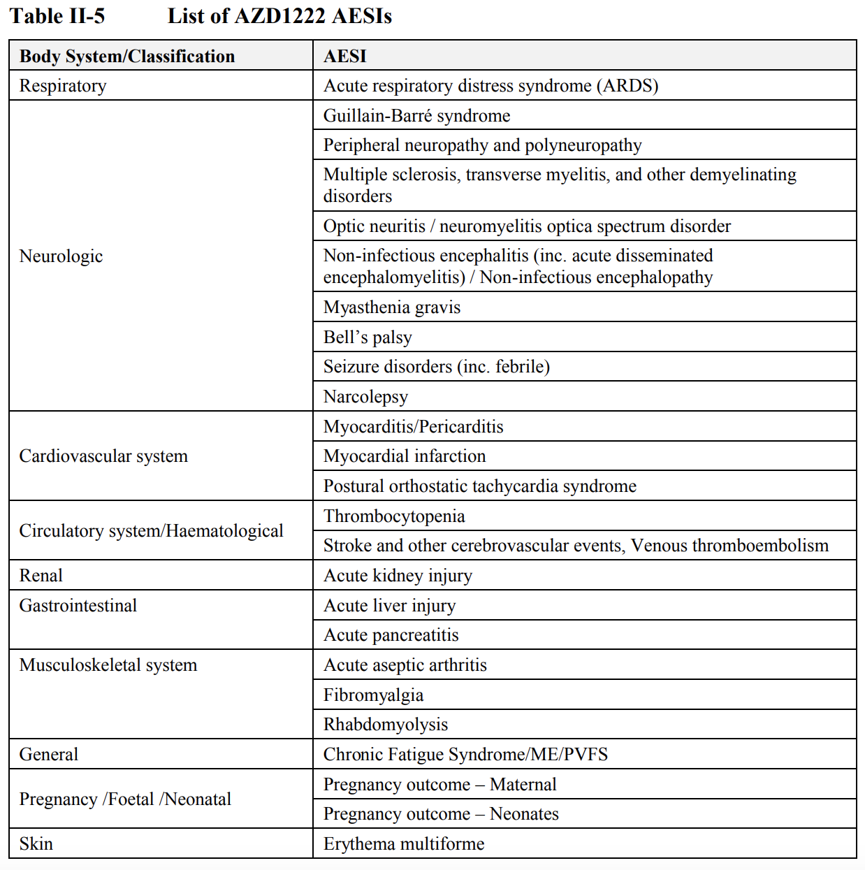 Until this evidence is produced, the European Medicine Agency has produced a ‘European Union Risk Management Plan’ for the AstraZeneca vaccine (drug substance: ChAdOx1-S (recombinant), AZD1222), which contains information about the vaccine’s safety. This plan includes a list of Adverse Events of Special Interest for the AstraZeneca vaccine. These are adverse reactions that may be of interest in the context of a mass COVID-19 vaccine administration campaign for COVID-19, such as the one currently being carried out in the UK. The list of Adverse Events of Special Interest (AESIs) applicable to the AstraZeneca vaccine that had been established from research and clinical trials by 4 November, 2020, 3 months before it was authorised for temporary use, include the following.